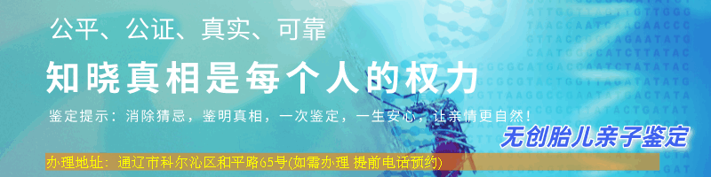 通辽无创DNA亲子鉴定办理地址:通辽市科尔沁区和平路65号(如需办理,需提前预约)预约电话:4001789498,通辽服务地区包括:科尔沁区、科尔沁左翼中旗、科尔沁左翼后旗、开鲁县、库伦旗、奈曼旗、扎鲁特旗、霍林郭勒市等周边城市通辽,可在线咨询:无创DNA亲子鉴定、司法亲子鉴定、移民亲子鉴定、入户亲子鉴定、中考报告亲子鉴定、高考亲子鉴定、个人隐私亲子鉴定等等咨询服务和提供专业知识及答复。